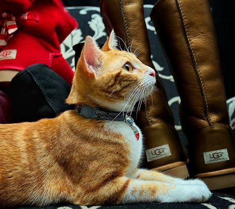 Where to begin: Simon, that cat could not be cuter. 🙂 Any picture will be improved by a Simon – wish I could get one. Love, love, love those copper Uggs. That chicken in the supermarket is too much (somehow, this never happens in Valencia – cranky people here? dunno). I have only Ugg slippers – it is never cold enough here ever to wear all my lovely lined boots. I look at them from time to time with fond memories or the occasional trips to the snow, when I wear them. But, that’s it. We are sweltering most of the year. Anyway, I really do love that blue color, too. Great idea. I hope you do more like this interspersed with the usual. Remind me, what is the advantage of a 70-200 lens, you probably told us but I am a bit groggy right now…