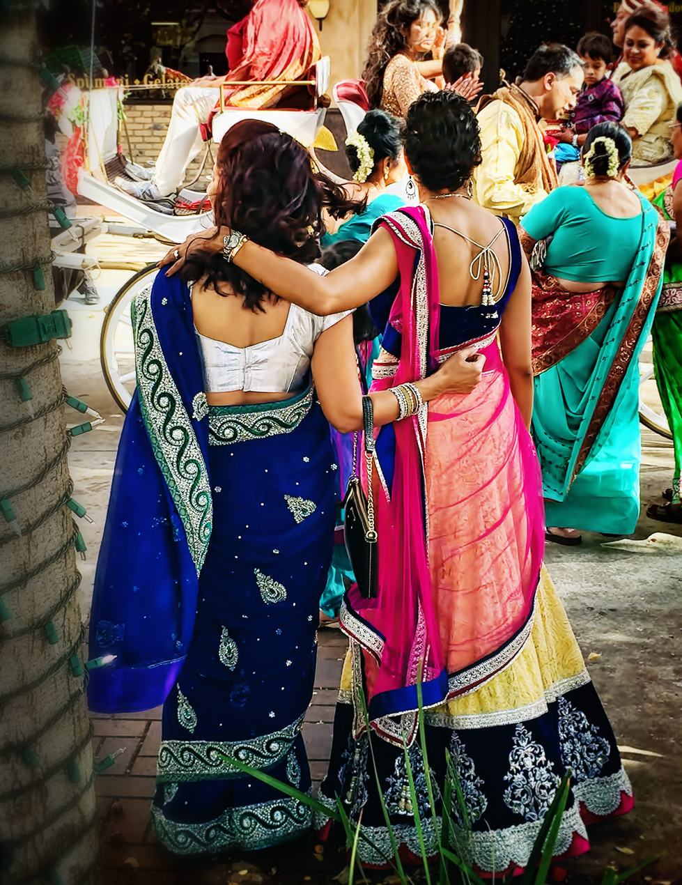 I knew when these two lined up in front of me and put their arms around each other that I had something special, and I was so pleased with how this turned out. Most of my photos were blurry and grainy and not very clear, but this one worked out perfectly. In front of them you can see the horse-drawn carriage, carrying I’m not sure who, quite honestly. In a traditional punjabi baraat it should be the groom riding a white horse, not sitting in a carriage, and he would be by himself. There is another ceremony for after the wedding which involves a bride and groom in a carriage, but this was clearly taking place before the wedding, so I’m just not sure what’s going on here. It really appeared to me to be the bride and her family in there, but I couldn’t find any information about Indian weddings where this would be the case. So, who knows. Still, picture so yay.