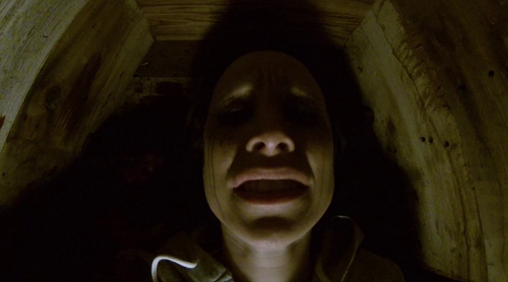 Chase texts again, telling them “They’re in your room now.” Rebecca finally drops the camera and takes off. Margot picks it up and chases after her. Rebecca charges down the stairs and out the front door. She’s decided to give the car another try, and as soon as she and Margot climb inside, we’re back to watching old footage of Catherine again, which is a pace-killer at first because we’re just watching stupid Patrick act like a freak some more, but then we hear a female giggle and dead Margaret appears in the hallway, and I have to admit it’s a pretty good scare. She’s wearing that Faust mask and her bloody dress, and the camera freezes on her standing in the hallway with her head tilted at a freaky angle. Then it’s talking head time as Alicia relays the events that led up to a mass suicide at the Abaddon. Then it’s back to Catherine, hiding out behind her bed and apparently filming herself, which led me to wonder where the parents have been throughout this whole thing. We know it’s the mother and Catherine who get murdered in their beds, while the father disappears as does Patrick, but in all the old footage it appears to just be Catherine in the house with Patrick. You’d think they would all huddle together while the madness happens, or that maybe Mom and Dad would be trying to protect her, but they are distinctly AWOL. I’m going to assume they’ve already been murdered and that Catherine has some weird sort of amnesia that has made her forget she has parents. Let’s move on.