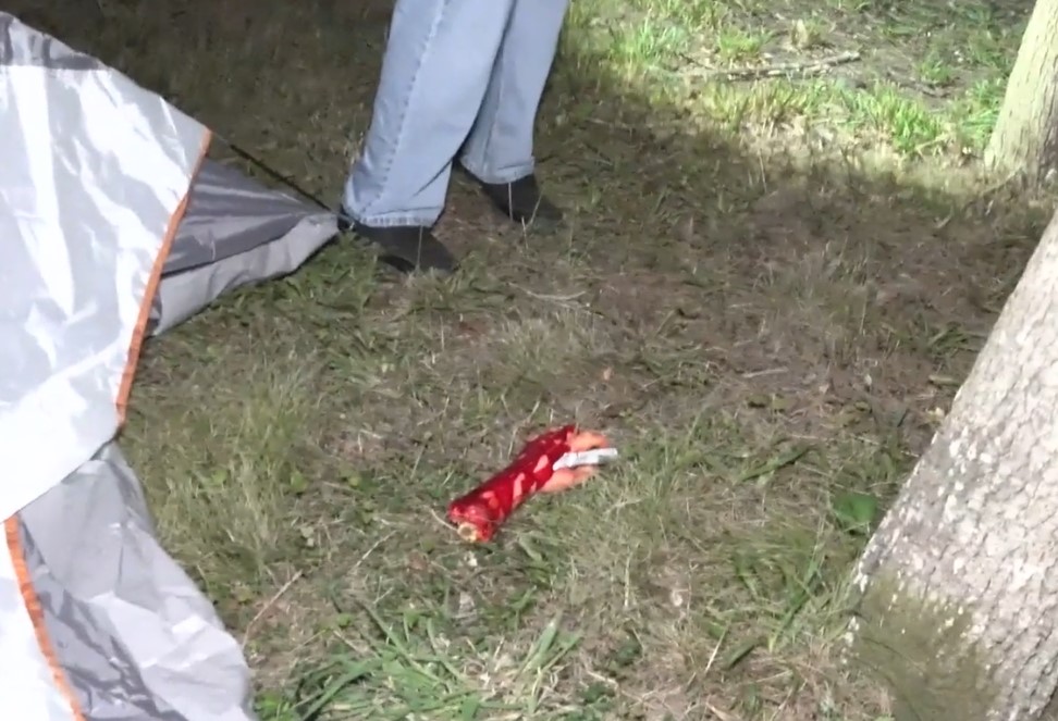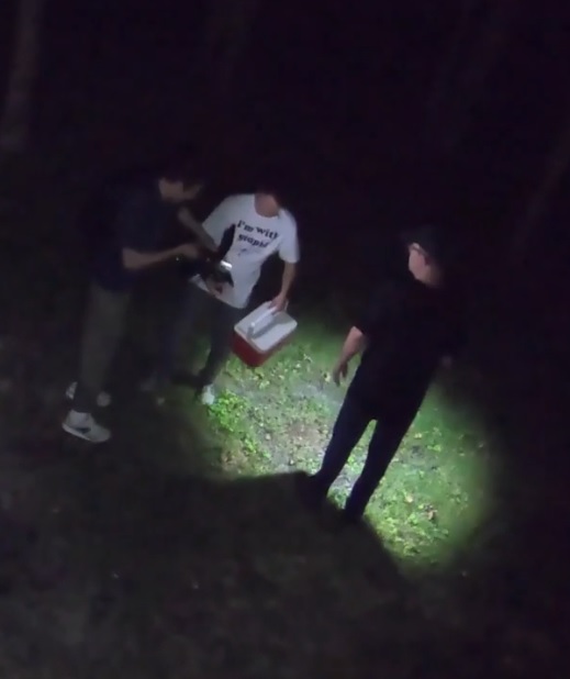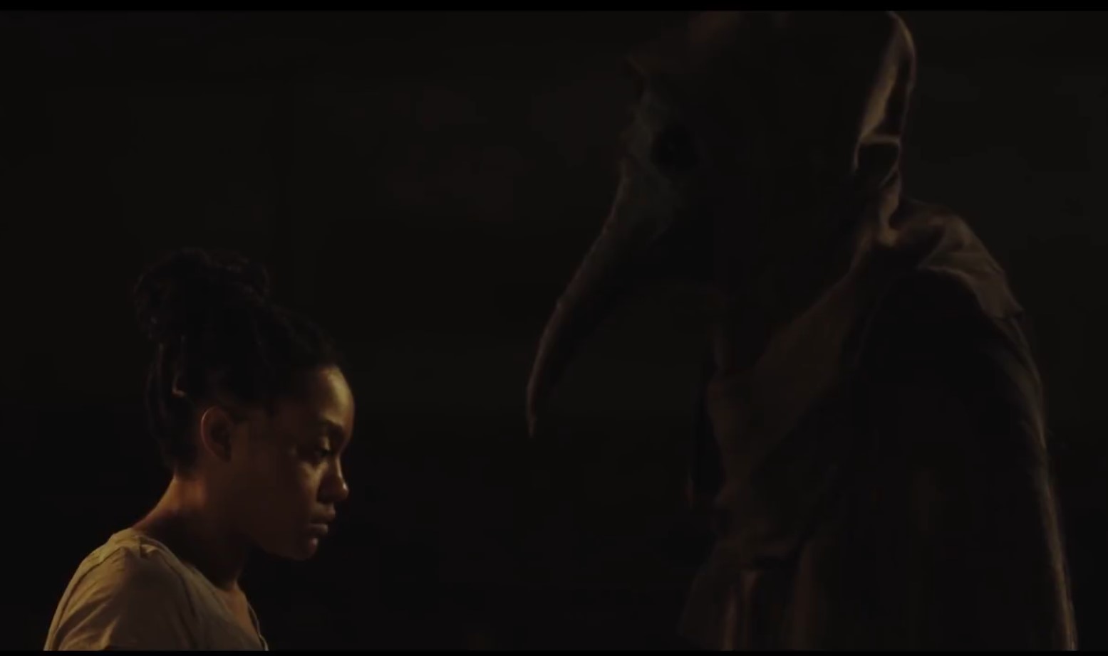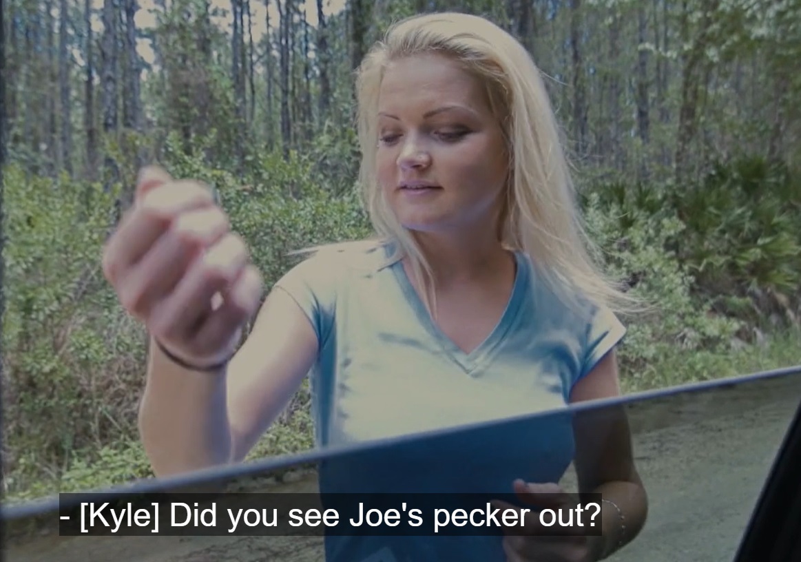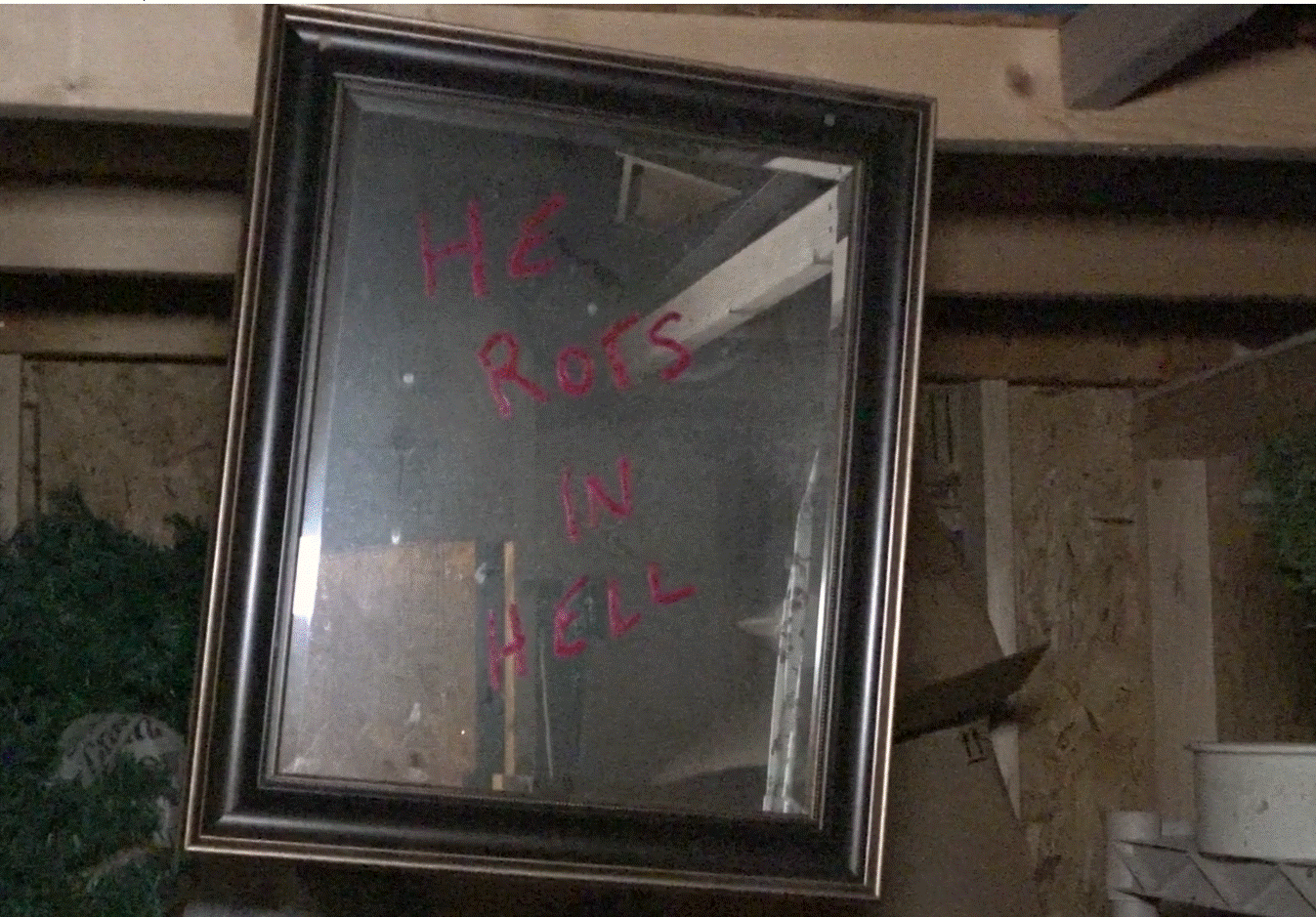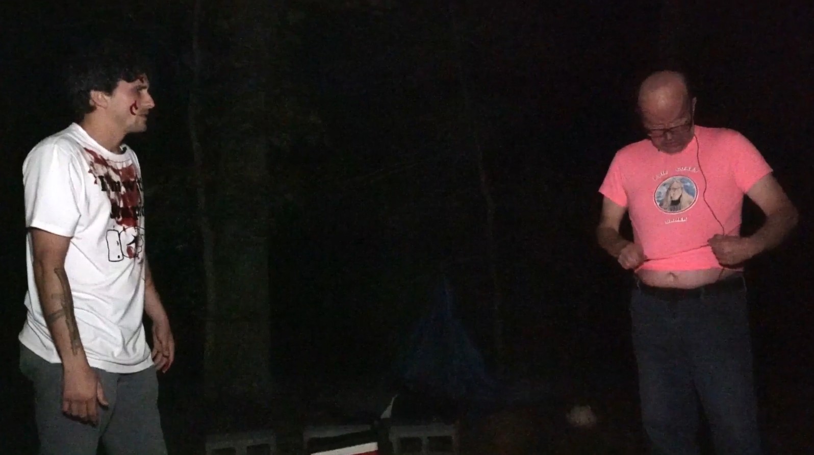 They pass by piles of old drums and the occasional rusty car, which isn’t unusual when one owns acres of land, because everyone’s crap has gotta go somewhere and where else is it gonna go. Maybe to Donald’s? He’s close after all. The piles of trash get weirder as they go, though; crosses with weird shit on them, an old hearse, an old RV, et cetera. Then something screams. Soon, in the distance, they see a hooded figure. Ah yes, the robed figures. We’ve seen them before. They start to run, and when the camera turns around, there are now three robed figures. They run faster. The eerie screams in the forest continue.