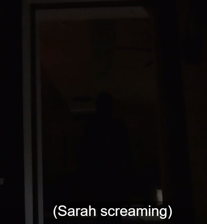 Meanwhile, Chase is at home mugging for the camera, pretending to be a ghost and a true crime detective to mess with his sister. He’s actually funny here, so it works. Of course, he hears a noise and goes to investigate. He walks into the hall and sees a shadow crossing the storage room, but when he enters nothing has changed. And of course, the power is out, so it’s a bit dark even though it’s the middle of the day. We clearly hear a giggle, and Chase swings the camera around. Something is extending out from a doorway at the end of the hall. I swear the first time I watched this I thought it was a nose until it slowly pulled itself back finger by finger and I realized it was a hand. Then a girl in a mask peeps around the corner and stands there for a minute before slowly backing away. Chase, thank God, does not do that thing where he walks ever so slowly up to the doorway, but charges at it full speed instead. Points for Chase. As expected, there’s no one there, and then we hear Margot and Rebecca arrive.