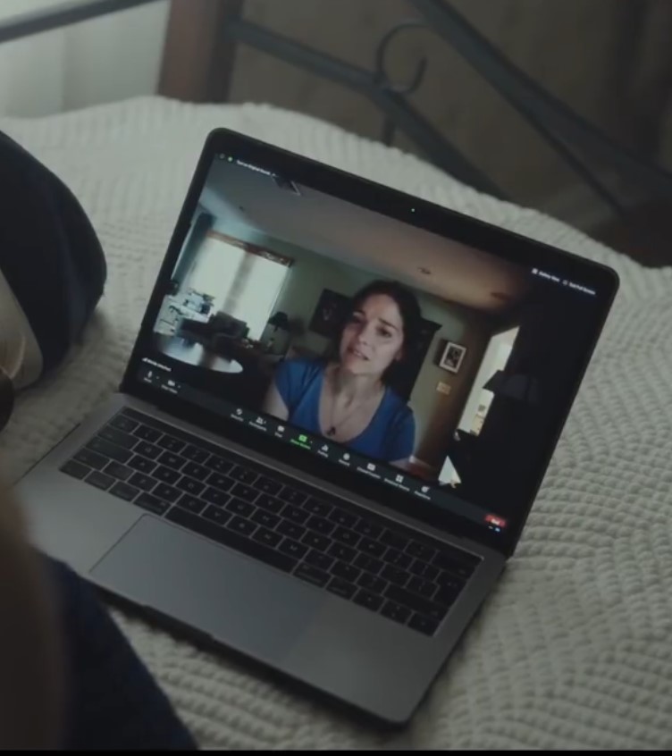 Rebecca has a Zoom call with a really bad actress. She’s showing her pictures of houses they can buy and flip, I guess, so this must be her boss. I’ll skip my rant about house flippers. After showing her a few slides, pictures of Carmichael Manor start showing up. The pictures start on the first floor and progress up the stairs until they’re right outside Rebecca’s room. In fact, we can see Rebecca in the photo, her back to us. The boss is understandably confused. And somewhat impatient, as Rebecca has stopped responding to her repeated questions about what’s going on. Rebecca keeps staring at the screen and clicking. Clicik! And there’s someone in the photo standing next to her. Click! Whoever is standing next to her has turned to face her. Click! And now we’re seeing Rebecca’s face, close up to the screen, with a very dead Catherine screaming into her ear. Heh. It’s a good one.
