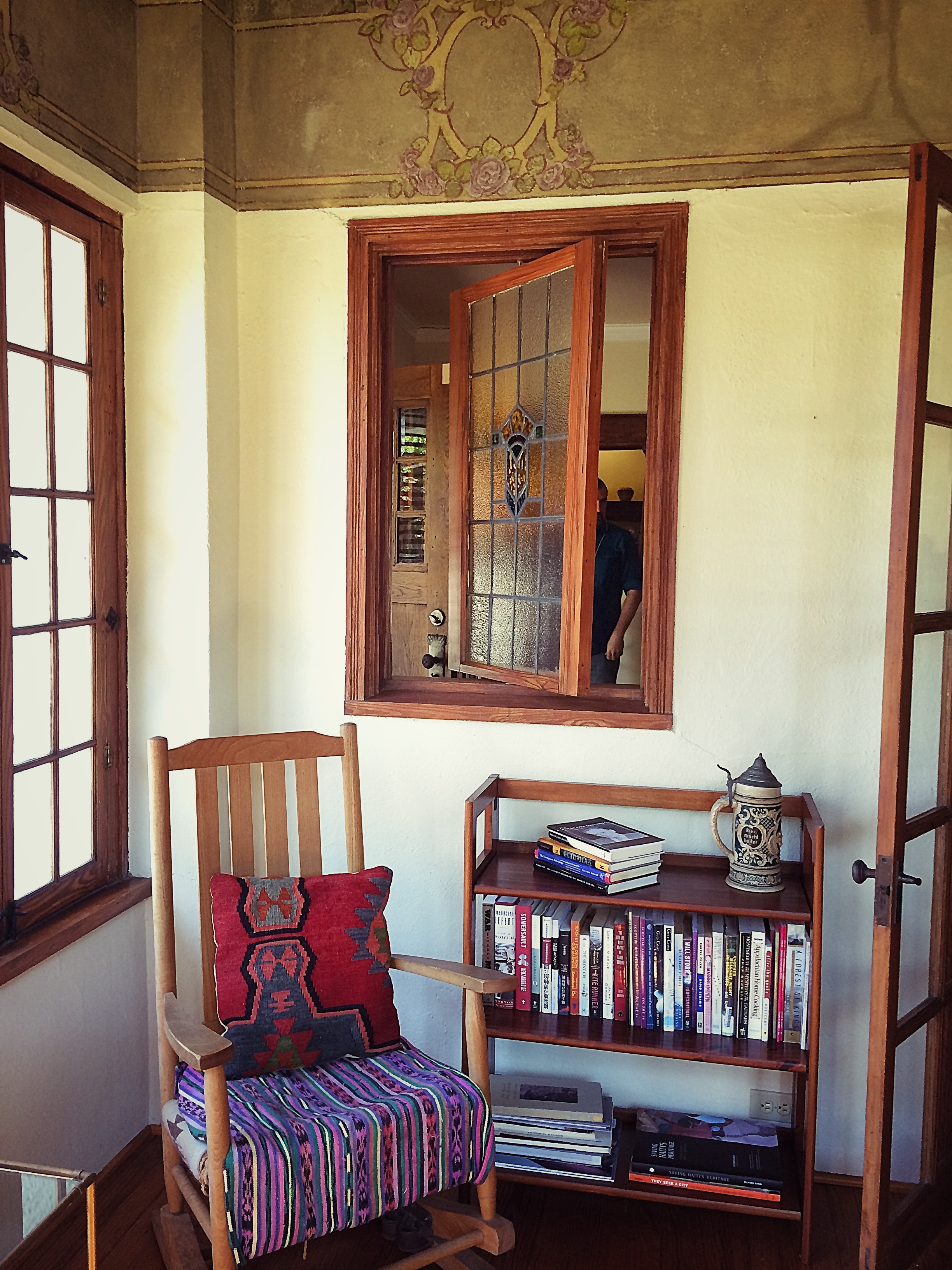 The sunroom, showing the rose stencils in action. The stained glass windows are a new addition.